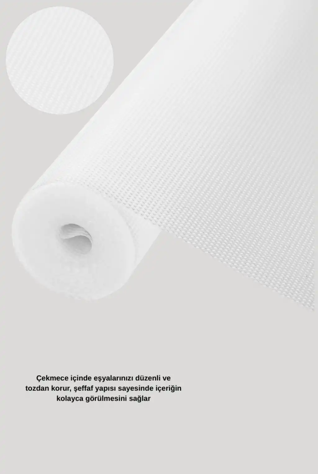 Bu şeffaf ve silikon tabanlı çekmece içi düzenleyici, çekmece içindeki dağınıklığı ortadan kaldırmak ve eşyalarınızı güvenle saklamak için tasarlanmıştır. Ürün 10 metre uzunluğundadır ve tek parça halinde gönderilir. Bu sayede uzun çekmecelerde tek seferde kullanılabilir ya da istenilen ölçülerde kesilerek birden fazla alanda değerlendirilebilir.Şeffaf tasarımı, çekmece içeriğinin kolayca görülmesini sağlar. Aradığınız eşyayı bulmak için çekmeceyi karıştırmanıza gerek kalmaz. Tozdan koruyucu özelliği, eşyaların daha temiz kalmasına yardımcı olur ve hijyenik bir saklama alanı oluşturur.Alt kısmında yer alan silikonlu kaymaz yüzey, çekmece içerisinde sabit durmasını sağlar. Çekmece açıldığında ürün kaymaz, içindeki eşyalar da dağılmaz. Dayanıklı plastik malzeme, ürünü sık kullanıma uygun hale getirir ve uzun süre formunu korur.Kolay temizlenebilir yapısı sayesinde su ile hızlıca temizlenebilir. 10 metrelik uzunluk, özellikle mutfak ve banyo gibi birden fazla çekmecenin bulunduğu alanlarda tek ürünle çözüm sunar. Pratik, dayanıklı ve düzen sağlayan bir çekmece içi çözümdür.