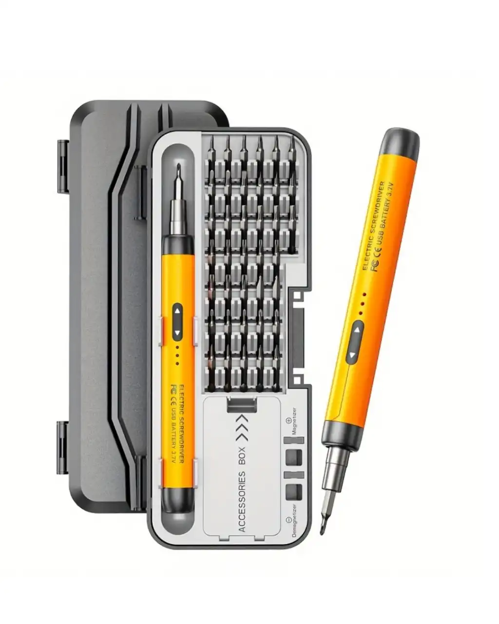 Kablosuz şarjlı elektrikli tornavida seti, profesyonel teknik servis kalitesini ev ortamına taşıyan güçlü ve kompakt bir tamir çözümüdür. Hassas elektronik cihazların güvenli şekilde sökülmesi ve montajı için özel olarak tasarlanmıştır. 3.7V DC Li pil teknolojisi ve 600mAh batarya kapasitesi sayesinde stabil, kesintisiz ve güçlü performans sunar. Type-C şarj girişi ile hızlı ve pratik şekilde şarj edilebilir.1100 devir/dak dönüş hızı, mikro vidalarda yüksek verim sağlar. 3.0–3.5 kgf.cm elektrik tork gücü, telefon, dizüstü bilgisayar ve oyun konsolu gibi hassas cihazlarda güvenli kullanım sunar. İleri ve geri dönüş özelliği sayesinde vidalama ve sökme işlemleri tek tuşla kolayca yapılır. Bu özellik zamandan tasarruf sağlar ve iş sürecini hızlandırır.Alüminyum alaşımlı gövde, hem hafif hem dayanıklı bir yapı sunar. Uzun süreli kullanımda el yorgunluğunu azaltır. 38 adet CRV tornavida ucu sayesinde farklı vida tiplerine uyum sağlar. Set içerisinde bulunan mıknatıslanma ve manyetiklik giderme aparatı, vidaların kontrolünü kolaylaştırır ve kaybolma riskini azaltır.Cep telefonları, laptoplar, kameralar, saatler, PS5, Xbox, Switch gibi oyun konsolları ve diğer dijital ürünlerin tamiri için idealdir. Profesyonel performans, ergonomik tasarım ve geniş aksesuar içeriği bir arada sunulmaktadır.