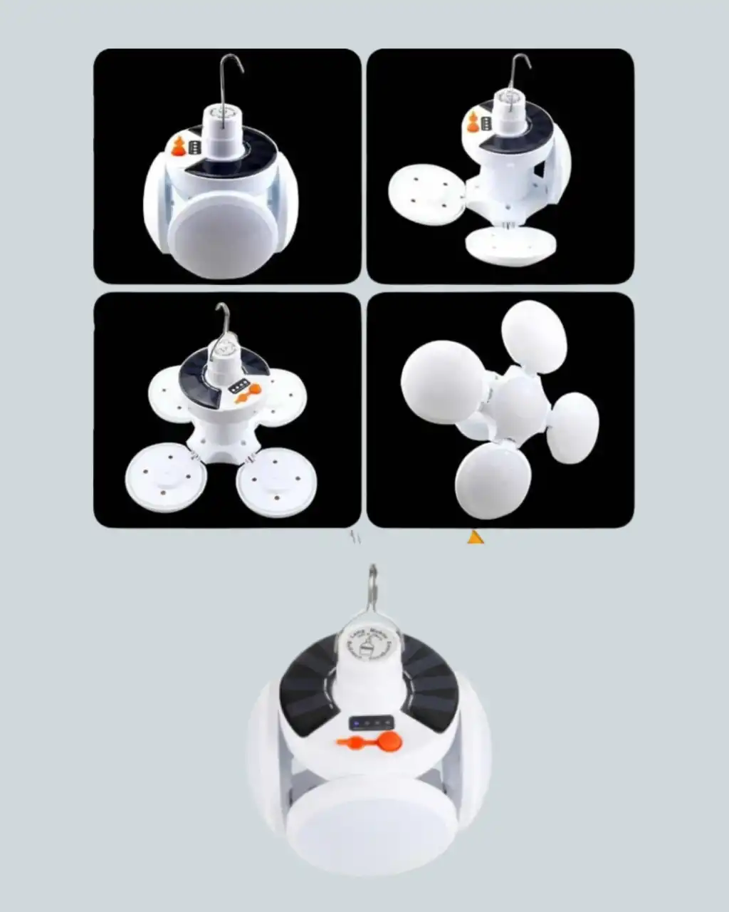 Bu çok yönlü kamp lambası,5 farklı aydınlatma moduna sahiptir. Katlanabilir LED panelleri 90 dereceye kadar açılabilir ve 360 derece ışık yayılımı sağlar. Güneş paneli sayesinde dış mekanlarda kolay şarj edilebilirken, USB girişi ile de elektrikli şarj imkanı sunar.Yüksek kapasiteli lityum iyon bataryası ile uzun süreli aydınlatma sağlar. Su sıçramalarına karşı IPX4 koruması bulunan cihaz, yağmurlu ya da nemli ortamlarda güvenli şekilde kullanılabilir. Asılabilir kancası sayesinde çadırlara, tavanlara veya dallara kolayca monte edilebilir. Kamp, gece balıkçılığı, piknik ve elektrik kesintilerinde pratik bir çözümdür.