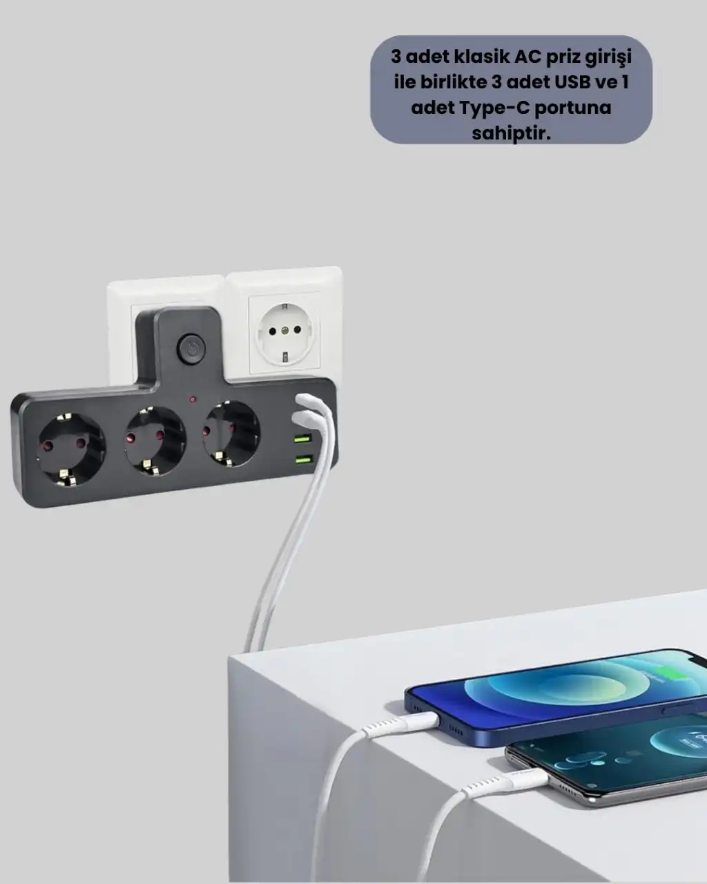 Günlük yaşamda artan elektronik cihaz kullanımı, tek bir prizden daha fazlasına ihtiyaç duyulmasına neden olur. Bu çoklu priz modeli, 3 adet klasik AC priz girişi ile birlikte 3 USB ve 1 Type-C portu sayesinde aynı anda 7 farklı cihazın güvenle kullanılmasını mümkün kılar. Telefon, tablet, laptop, kulaklık ve benzeri cihazlar için adaptör arama derdini ortadan kaldırarak pratik bir kullanım sunar.Akıllı güç dağılım sistemi sayesinde her porta bağlanan cihazın ihtiyaç duyduğu enerji otomatik olarak ayarlanır. Bu sayede aşırı akım riski oluşmaz ve cihazlar dengeli şekilde şarj edilir. Termal dengeleme özelliği, priz ve bağlı cihazların güvenliğini ön planda tutarak uzun süreli kullanımda dahi stabil performans sağlar.Üzerinde bulunan tek tuşlu açma-kapama düğmesi, tüm priz grubunun kolayca kontrol edilmesini mümkün kılar. Kullanılmadığı zamanlarda kapatılarak enerji tasarrufu sağlanabilir ve gereksiz elektrik tüketimi önlenir. Bu özellik özellikle gece saatlerinde güvenli kullanım açısından önemli bir avantaj sunar.Modern ve kompakt tasarımı sayesinde masa üstü, TV ünitesi veya çalışma alanlarında düzenli bir görünüm oluşturur. Dayanıklı malzemeden üretilmiş yapısı uzun ömürlü kullanım sunarken, hafifliği sayesinde kolayca taşınabilir. Hem ev hem ofis ortamlarında düzen, güvenlik ve konforu bir arada sunan ideal bir güç çözümüdür.