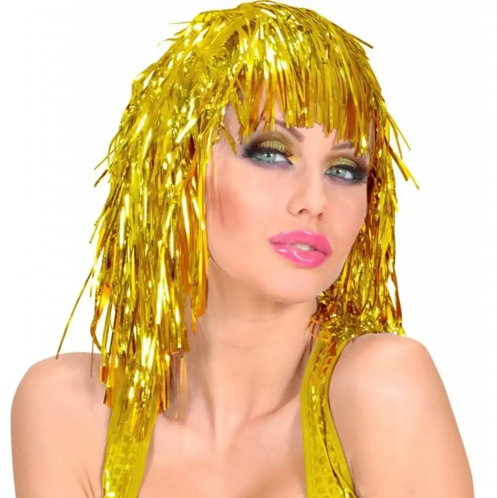 Gösterişli ve ışıltılı görünümün simgesi metalize altın peruk, her ortamda sizi ön plana çıkarır. Işıkla parlayan altın tonları sayesinde özel davetler, yılbaşı ve karnaval etkinliklerinde göz kamaştırıcı bir etki yaratır.