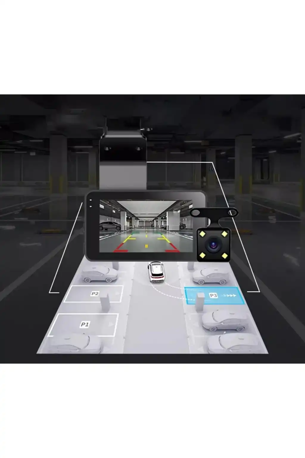 4. Akıllı görünüm anahtarlama: Sürüş ve park için akıllı bir anahtarlama fonksiyonu ile donatılmış olan otomobil veri kaydedicimiz, sürüş sırasında net arka görüş görüntüleri sağlar ve gerektiğinde park yardımı için daha yakın bir açıya geçer.