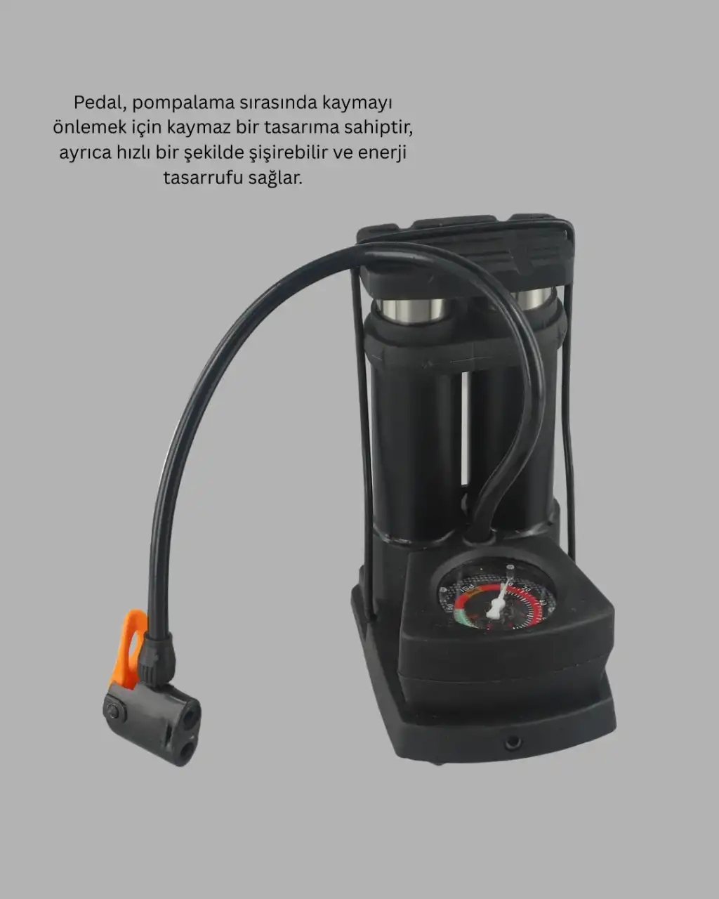 Bu basınç göstergeli ayak pompası, hava akışını başlatmak için sadece pedala basmanızın yeterli olduğu pratik bir kullanım sunar. Geniş ve kaymaz ayak pedi sayesinde pompalama sırasında dengeli bir duruş sağlar.Yüksek hassasiyetli ölçüm saati, lastik basıncını net şekilde görmenize yardımcı olur. Böylece lastiğinize zarar vermeden ideal basınca ulaşabilirsiniz.Bisiklet, motosiklet, elektrikli araç, spor ekipmanları ve şişme ürünlerde kullanılabilen bu pompa, hem ev hem dış mekân kullanımı için uygundur.