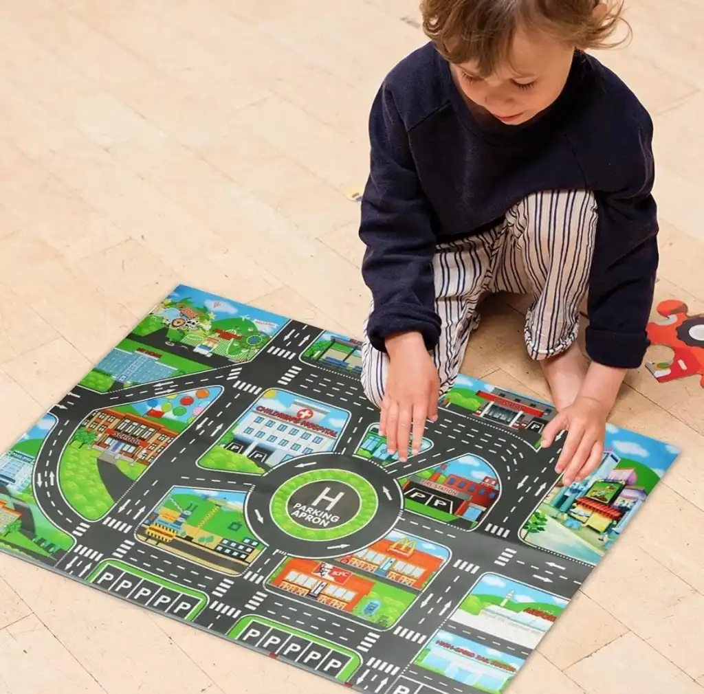 • Yolda Oyun Süresi: Araba Halımızda renkli bir şehir manzarasını keşfedin ve canlı yollar ve binalarla yol maceralarını daha ilginç hale getirin. Çocuğunuzun hayal gücünü harekete geçirin ve daha fazla eğlenceyi teşvik eden canlı bir oyun alanı yaratın.