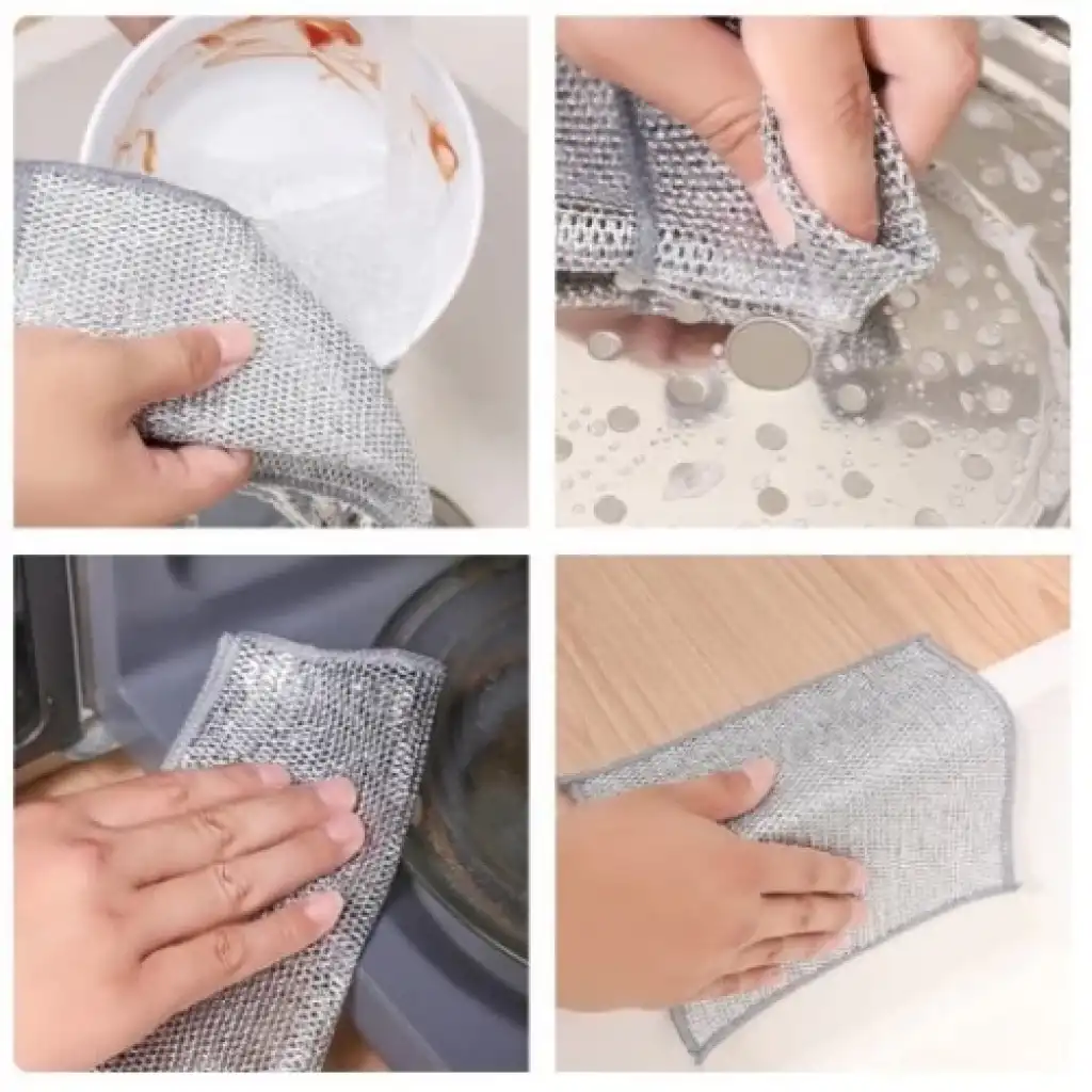 Tel bulaşık bezi, ıslak ve kuru temizleme için mükemmeldir ve tel bulaşık bezi, bulaşıklardan, tencerelerden, fırın tepsilerinden, fırınlardan ve daha fazlasından inatçı lekeleri herhangi bir yüzeyi çizmeden kolayca çıkarmak için tasarlanmıştır.