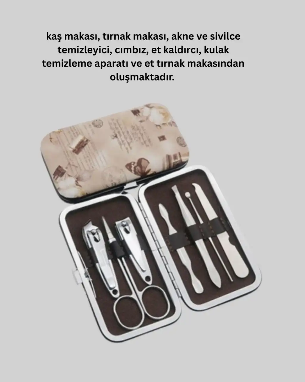 Kompakt tasarımı ve çok yönlü kullanımıyla bu kişisel bakım seti, hem kadınlar hem erkekler için ideal bir üründür. İçeriğinde bulunan tırnak makası, kaş makası, cımbız, kulak temizleme aparatı, et tırnak makası, et kaldırıcı ve sivilce temizleyici aparatlar sayesinde kişisel bakımınızı eksiksiz şekilde tamamlayabilirsiniz. Paslanmaz çelikten üretilmiş olan parçalar sağlamlığıyla uzun yıllar kullanım sunar. Şık çantası, hem düzenli saklama hem de kolay taşıma imkanı sağlar. Küçük boyutları sayesinde çantanızda fazla yer kaplamaz ve her yerde kullanım kolaylığı sağlar. Günlük kişisel bakımını önemseyen herkes için kaliteli ve pratik bir tercihtir.