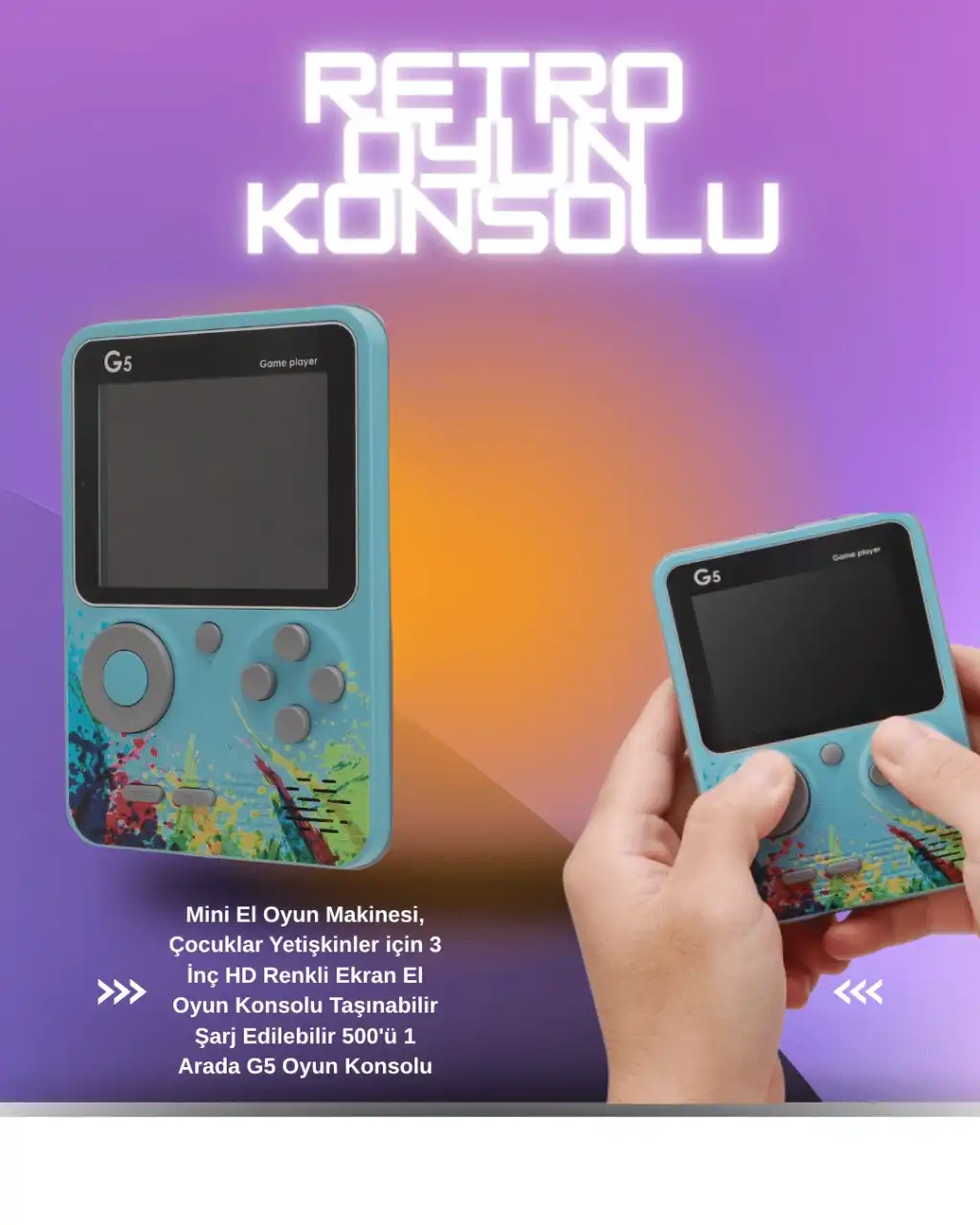 Gelişmiş renkli 3 inç LCD ekranı, oyun deneyimini daha net ve canlı hale getirirken, ergonomik tuş yerleşimi sayesinde uzun süreli kullanımda konfor sağlar. Oyunlar doğrudan cihazın hafızasına yüklü olarak geldiği için ekstra indirme, kurulum veya internet bağlantısına gerek yoktur. Ayrıca cihaz, AV kablo yardımıyla televizyona bağlanarak daha büyük ekranda da oynanabilir – bu özellik özellikle ailece eğlenmek isteyenler için büyük avantaj sunar.USB kablo ile şarj edilen dahili bataryası, tek şarjla uzun süreli kullanım sağlar. Elektrik bağımlılığı olmadan özgürce oyun oynayabilirsiniz. Dayanıklı plastik kasası, düşmelere ve çizilmelere karşı dirençlidir. G5 Game Box, hem geçmişin oyunlarını yaşatmak isteyen yetişkinler hem de keşfetmeye hevesli çocuklar için eğlenceli, kullanışlı ve duygusal değeri yüksek bir cihazdır.