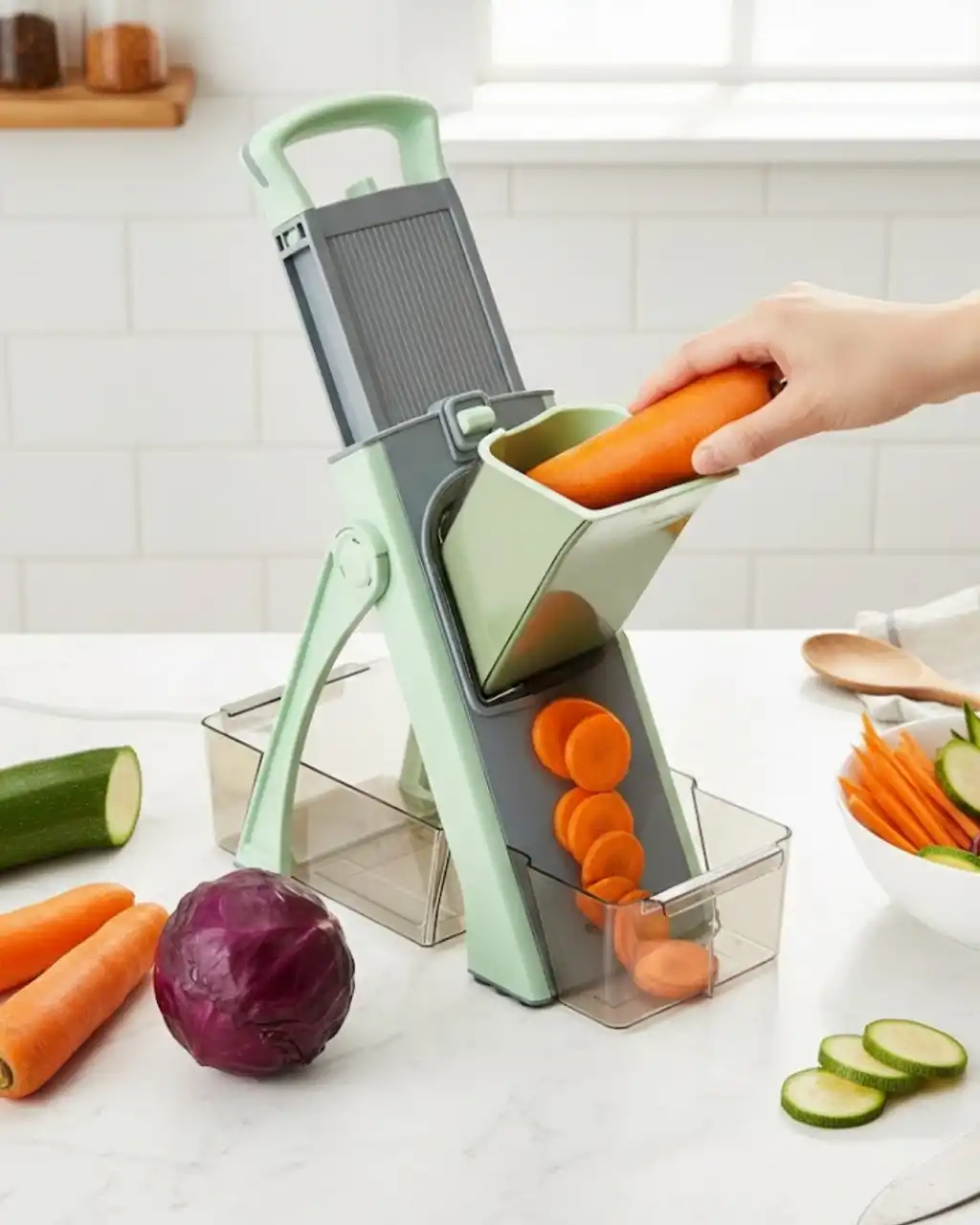 Yüksek kaliteli çelikten üretilmiş el rendesi, sağlam yapısı sayesinde uzun ömürlü kullanım sunar. Paslanmaz doğrama bıçakları, sebze ve meyveleri kısa sürede ve eşit şekilde dilimlemenize olanak tanır. Günlük mutfak işlerinde pratiklik arayan kullanıcılar için ideal bir yardımcıdır.Üst aparatı sayesinde birkaç basit hareketle ürünleri istediğiniz kıvama getirebilirsiniz. Güvenliği ön planda tutan tasarımı, ellerinizin bıçaklara yaklaşmasını engeller. Bu özellik, özellikle yoğun mutfak kullanımında büyük avantaj sağlar.Katlanabilir gövde yapısı, yer tasarrufu sağlar. Fırça ve hazne desteği sayesinde hem temizlik hem de düzen kolaylaşır. Kolay temizlenebilir yüzeyi, hijyenik kullanım sunar.