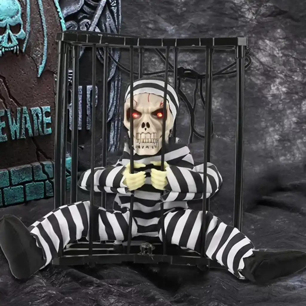 Hareketli Sesli Sensörlü Mahkum Görünümlü Kuru Kafa İskelet Dekorasyon