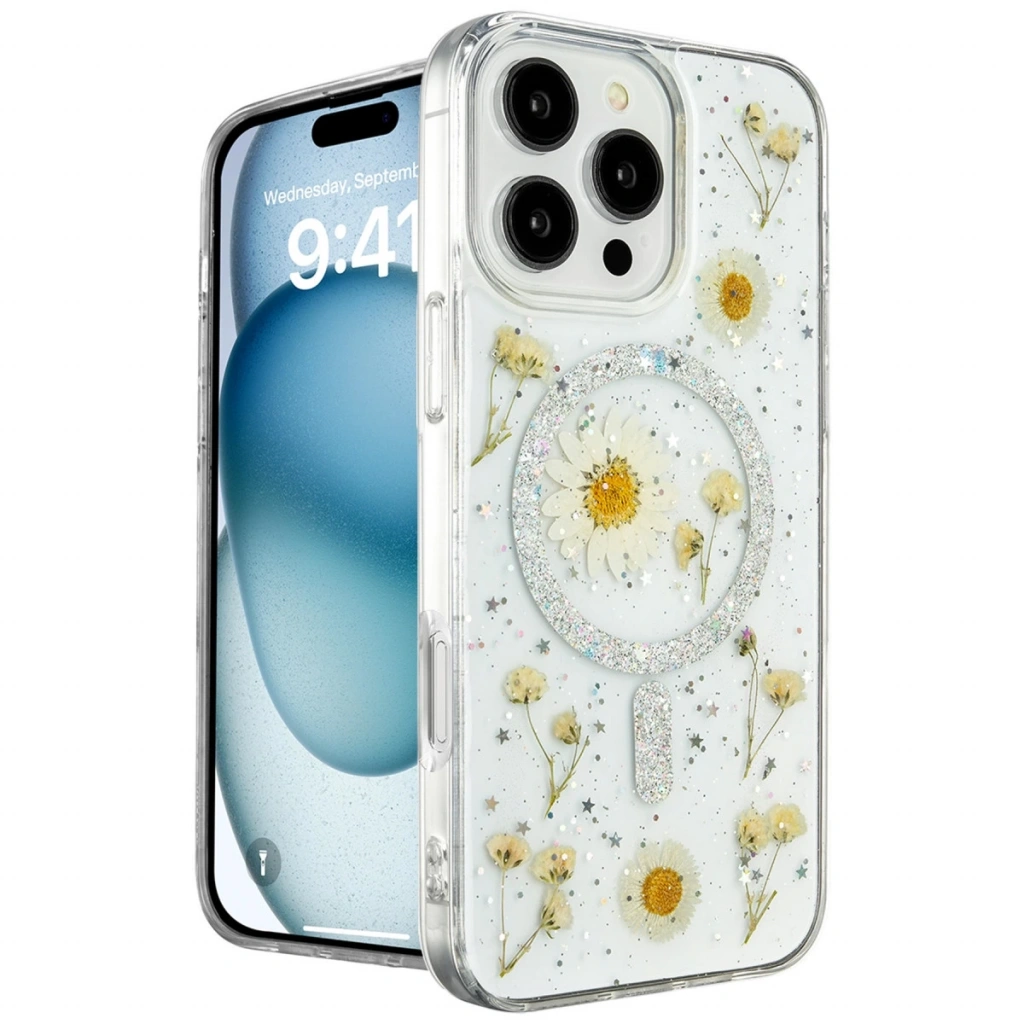 Daisy Simli MagSafe Kapak, doğanın zarafetini ve sadeliğini yansıtan, içinde gerçek çiçeklerin bulunduğu eşsiz bir tasarıma sahiptir. Kapak, içindeki gerçek papatya çiçekleri ve simli arka planı ile cihazınıza doğal bir güzellik katarken, her kapak kendi içinde benzersizdir. Bu, telefonunuzu hem korurken hem de ona kişisel bir dokunuş ekler.