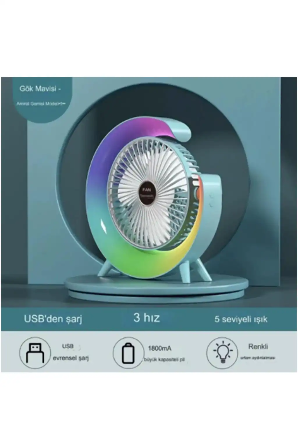 Masaüstü Vantilatör Usb Şarjlı Rgb Led Işıklı 3 Kademeli 180° Ayarlanabilir Soğutucu Fan Mavi
