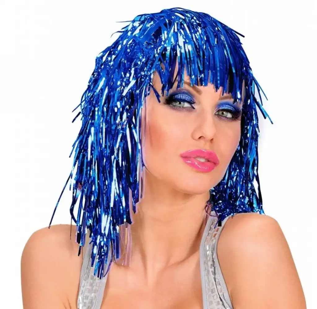 Parıltılı ve özgün bir tarz isteyenler için metalize mavi peruk, eğlenceli ve enerjik görünümler için mükemmeldir. Işığı yansıtan parlak mavi folyo yapısıyla disko ve sahne ışıkları altında muhteşem görünür.
