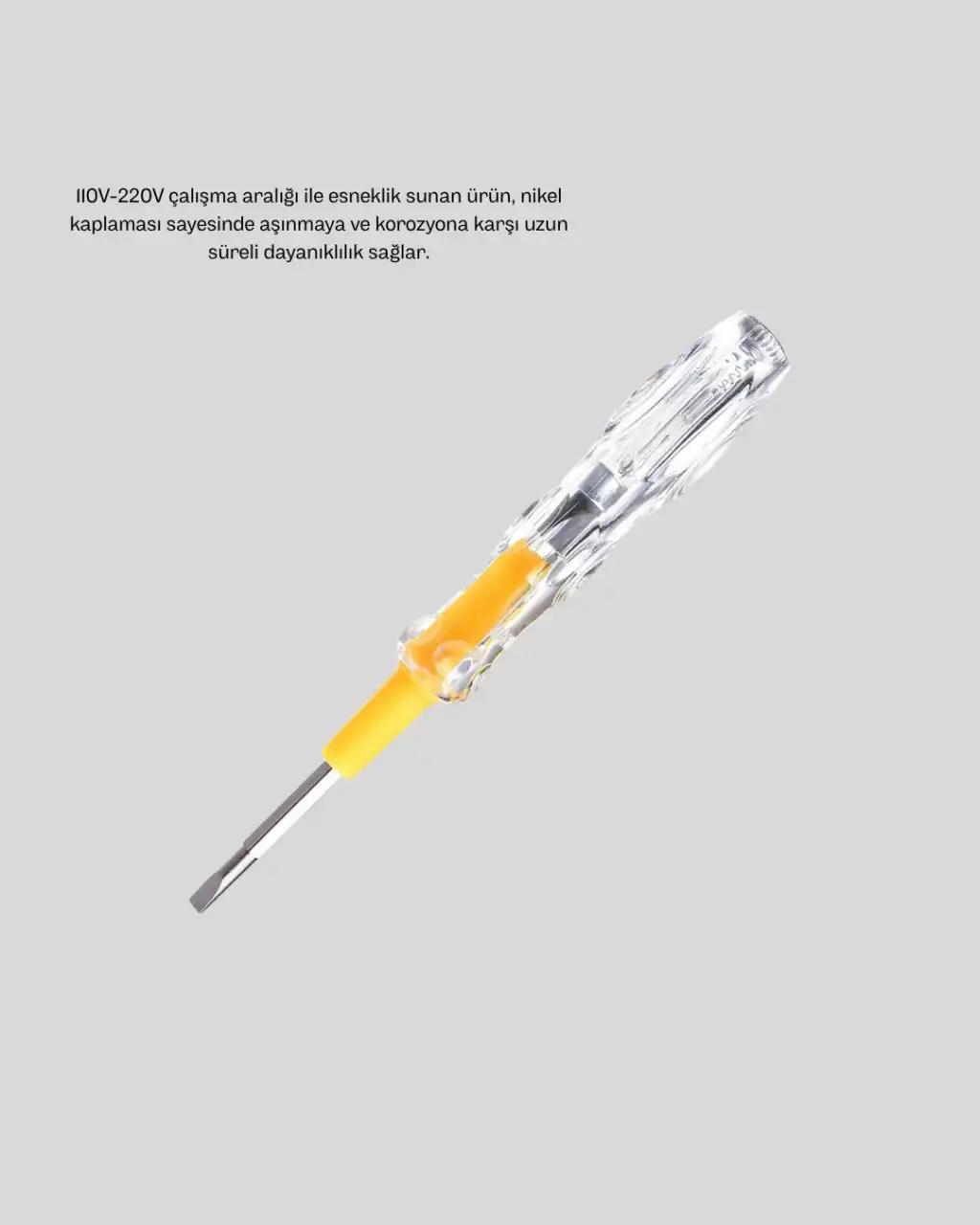 Yüksek güvenlik ve dayanıklılığı bir arada sunan bu profesyonel neon kontrollü kontrol kalemi, hem ev tipi hem de endüstriyel elektrik uygulamaları için ideal bir seçimdir. Tam sızdırmazlık sağlayan pirinç kapak, ürünün uzun ömürlü olmasını sağlarken, elektrik kaçaklarını önleyerek maksimum güvenlik sunar. Şeffaf yalıtkan sapı, elektrik yalıtımı görevini mükemmel şekilde yerine getirir ve kullanım sırasında darbeye karşı üstün direnç gösterir.Kalem üzerindeki neon lamba, aktif akımın varlığını kolayca görmenizi sağlar. Bu sayede 110V - 220V arasındaki geniş çalışma aralığında, enerji hattı kontrolü ve elektrik testi işlemleri son derece güvenli ve pratik hale gelir. Özellikle düşük ışıklı ortamlarda bile neon göstergesi sayesinde net görünürlük sağlanır.Nikel kaplama uç kısmı, oksitlenmeye ve aşınmaya karşı ekstra koruma sunar; böylece uzun yıllar boyunca ilk günkü performansını korur. Hassas işlenmiş uç tasarımı, vida yuvalarına tam oturarak yüksek temas yüzeyi oluşturur ve doğru ölçüm yapmanızı sağlar.Profesyonel standartlarda üretilen bu kontrol kalemi, tamir, montaj, bakım ve elektrik test işlemlerinde güvenli kullanım sağlar. Ev kullanıcıları, teknisyenler ve ustalar için vazgeçilmez bir yardımcıdır.Kompakt boyutu sayesinde cebinizde veya alet çantanızda kolayca taşınabilir. Güvenliği, dayanıklılığı ve ergonomik yapısıyla bu test kalemi, her elektrik uygulamasında profesyonel sonuçlar elde etmenizi sağlar.