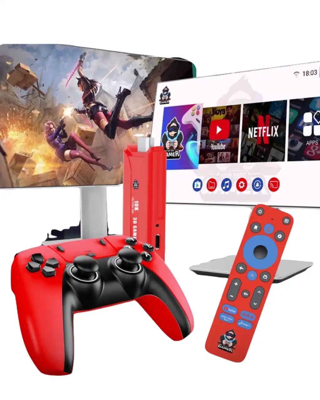 Retro tasarımlı Android Game Stick, nostalji ve modern teknolojiyi bir araya getirir. 10K HD görüntü desteği sayesinde keskin ve net görüntü sunar.64GB dahili hafıza ile geniş oyun kapasitesi sunar. İki adet oyun kumandası ile çift kişilik oyun desteği sağlar.5G WiFi bağlantısı güçlü çekim gücü sunar. Oyunlar arası geçiş hızlıdır, donma yapmaz.YouTube ve Netflix gibi uygulamalar hazır yüklüdür.