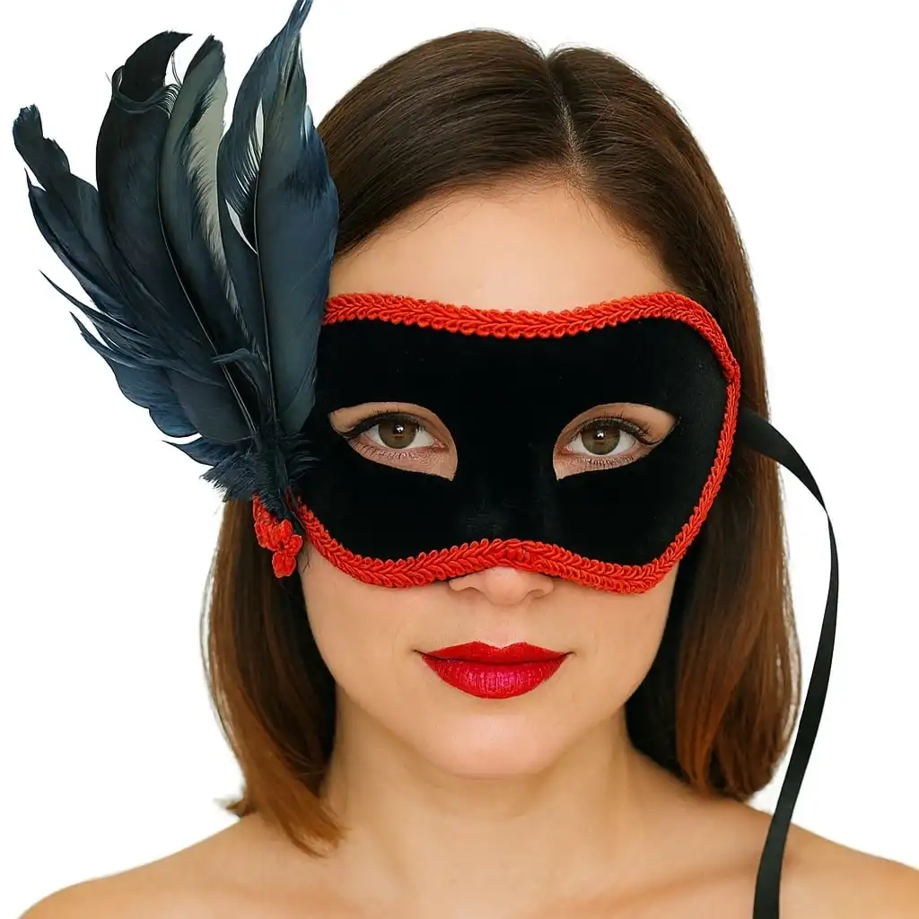 Siyah Renk Yandan Tüylü Siyah Süet Kaplama Parti Balo Maskesi