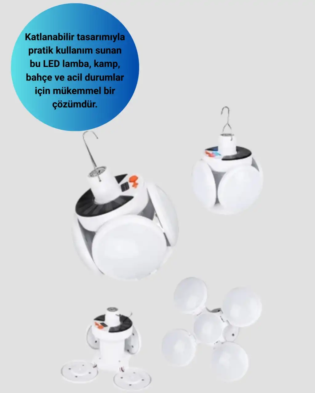 USB ve solar şarj özellikli katlanabilir LED lamba, pratik kullanımı ve güçlü aydınlatması ile çok yönlü bir üründür. 5 kanatlı tasarımı sayesinde 360 dereceye yakın aydınlatma sağlar. 45 LED ışık kaynağı, yüksek parlaklık sunarken 2400mAh pili ile 6-8 saat boyunca çalışabilir. Güneş enerjisiyle veya USB kablosu ile kolayca şarj edilebilir. IP65 sertifikalı su geçirmez özelliği sayesinde dış mekanlarda güvenle kullanılabilir. Bahçe, kamp, sokak aydınlatması ve acil durumlar için uygundur. Katlanabilir yapısı sayesinde kompakt ve taşınabilir bir tasarıma sahiptir. Enerji tasarruflu yapısı ile çevre dostu bir çözümdür.